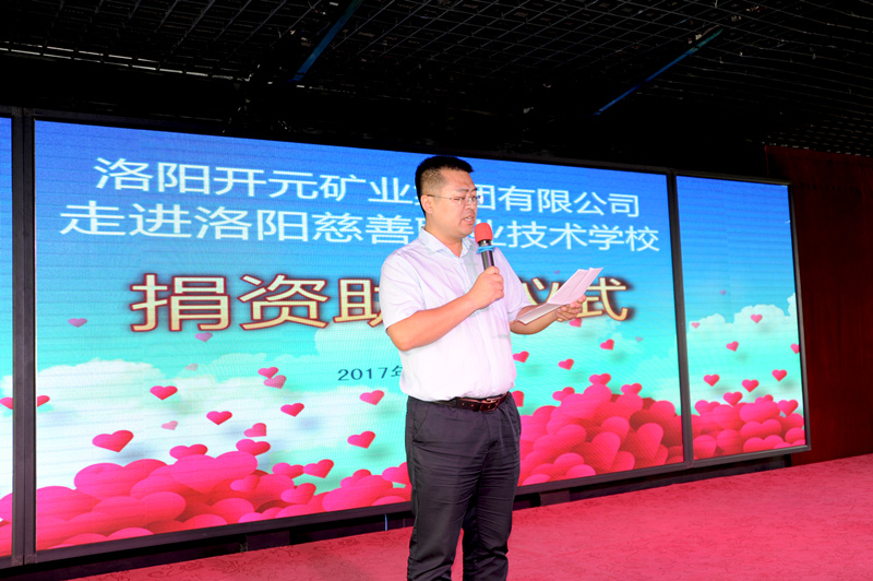 上午10點20分儀式開始,集團(tuán)總經(jīng)理助理叢萬通代表公司發(fā)表講話,他重點談到:近年來,開元礦業(yè)集團(tuán)在董事長許明月的帶領(lǐng)下,強(qiáng)力推進(jìn)企業(yè)發(fā)展的同時,積極開展各項社會公益活動,在慈善愛心公益領(lǐng)域不遺余力,先后為汝陽縣馬溝小學(xué),洛寧縣東宋鎮(zhèn)郭村小學(xué)、兒童福利院、興華鎮(zhèn)中心小學(xué),宜陽縣紅斑狼瘡重病小女孩、文物保護(hù)維護(hù)等捐款捐物累計超過100萬元。作為洛陽慈善總會理事單位,得知洛陽慈善職業(yè)技術(shù)學(xué)校部分學(xué)生還沒有統(tǒng)一的職業(yè)西服后,集團(tuán)立即聯(lián)系校方,為學(xué)校捐贈60套校服西裝,價值9000余元;希望同學(xué)們將社會各界的關(guān)愛轉(zhuǎn)化為學(xué)習(xí)的動力,積極回報社會。